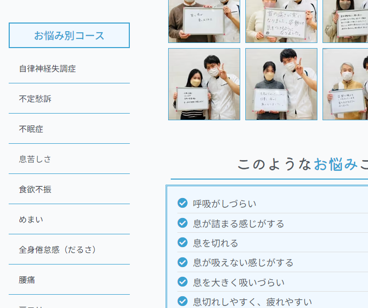 体の痛みだけでなく、不眠症や息苦しさ・めまい・耳鳴りなど、自律神経系の根本改善を専門にされている治療院です。通われた患者様の声を目立たせて、信頼感をアピールしています。薄いブルーを基調にした落ち着いたデザインで、安心感も感じられます。もちろんスマホ対応および常時SSLにも対応した作りになっています。