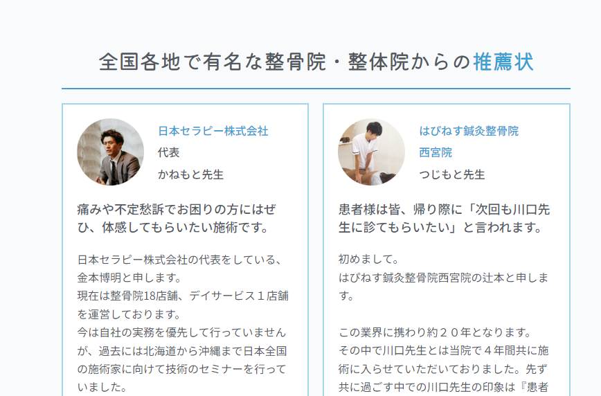 他の業種ではあまり見ることがありませんが、今回のような鍼灸院、整体院、整骨院などの治療院ホームページには他院の先生、または医療関係者などからの推薦の言葉が掲載されていることが多いです。