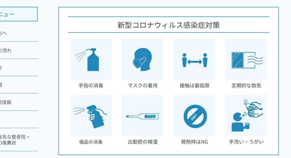 こちらのホームページを制作したタイミングはコロナウイルス感染症の真っただ中でしたので、上部の目立つところに感染症対策のパートを設置しました。手指の消毒やマスクの着用、定期的な換気、また検温の徹底など、当たり前のことのようではありますが、WEBサイト上に書いておかないとお客様には伝わりませんので、わかりやすく明記しておくことが大切です。
