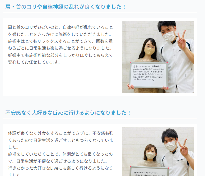 続けて、実際のお客さんの声を掲載することで、同じような悩みを持っている人であれば、ここに来れば改善するかも?という期待を持ってもらうことができます。こういったお客様の声はテキストだけではなく、やはりお客様本人の顔写真があった方が信頼も増します。