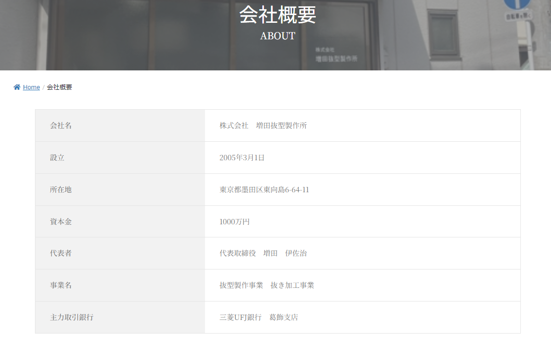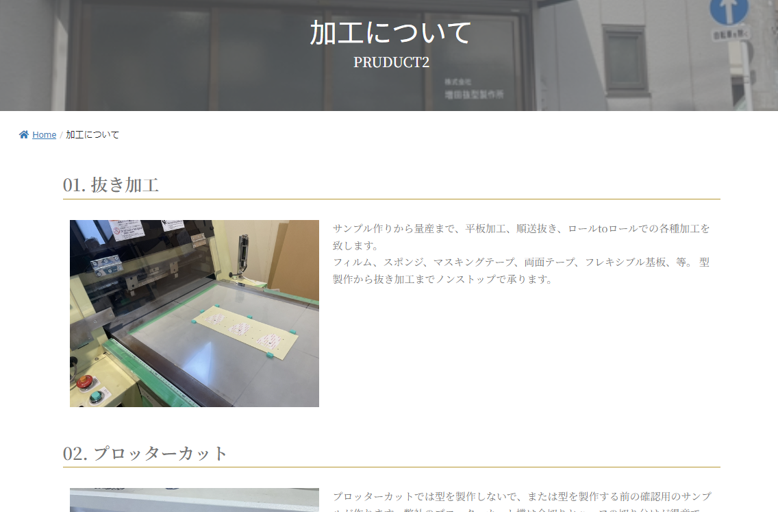 東京都墨田区にある抜型製作所のホームページを格安料金プランで制作しました。全体の構成はトップページ、会社概要、型について、加工について、お問い合わせの合計5ページになっています。