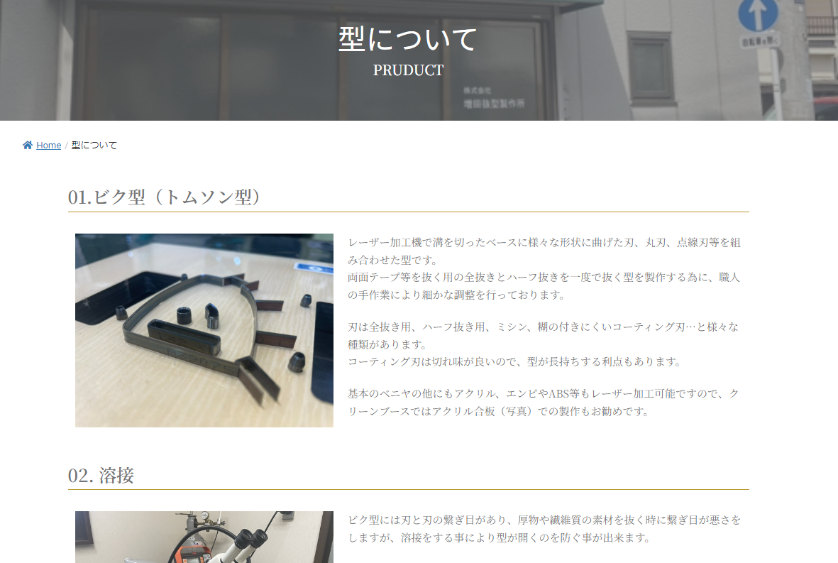 型についての詳細ページです。ビク型(トムソン型)、溶接、ピナクル型、治具の製作の4つについて、写真と共に説明を書いています。写真は実際の制作物や制作風景になっています。
