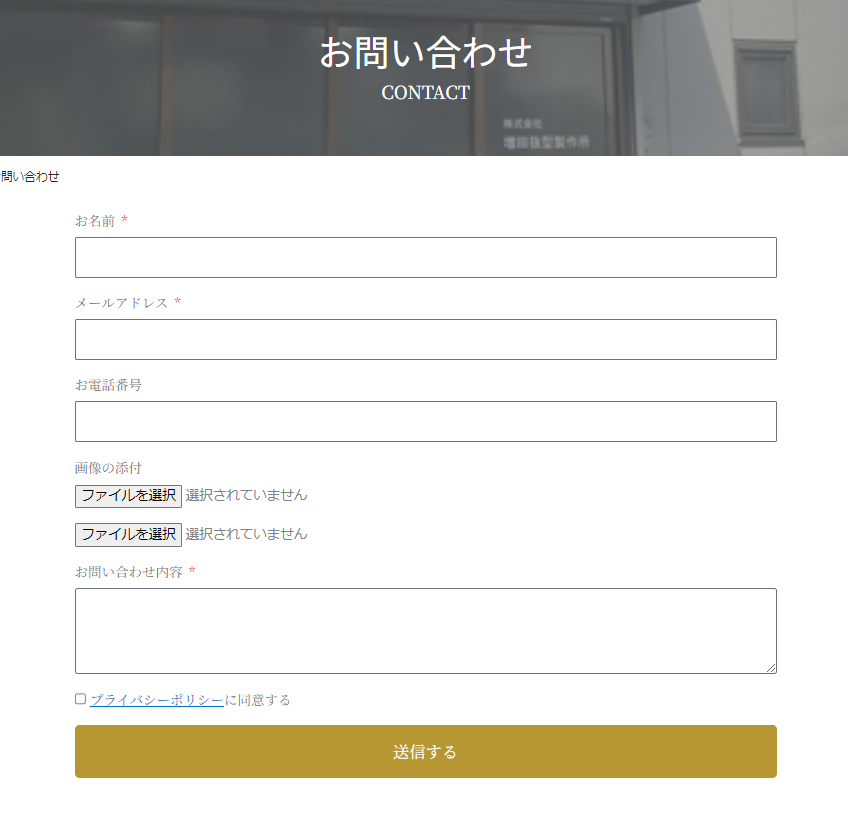 お問い合わせページはフォームを設置しており、お名前、メールアドレス、電話番号、画像の添付、お問い合わせ内容などの項目があります。どの項目を必須にするかは自由に選べますので、電話番号の入力と画像の添付は任意としています。またプライバシーポリシーページへのリンクも掲載しています。