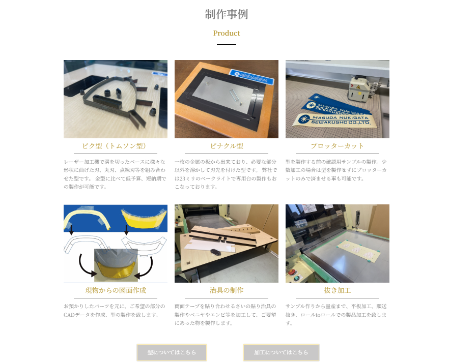 制作事例として、ビク型(トムソン型)、ピナクル型、プロッターカット、現物からの図面作成、治具の制作、抜き加工の6種類の例を掲載しています。現物の写真を載せているので、注文する側からするとイメージが湧きやすいと思います。