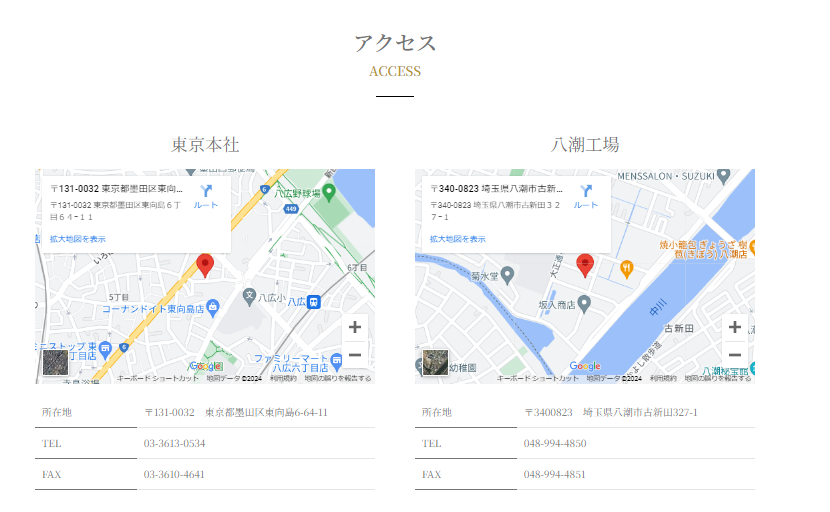 アクセスのところには、東京にある本社と埼玉県にある八潮工場の2か所の所在地とGoogleマップ、それと電話・FAX番号を掲載しています。