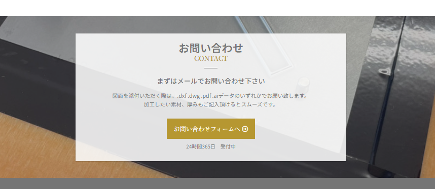 お問い合わせはメールフォームで24時間受け付けています。「図面を添付いただく際は、.dxf .dwg .pdf .aiデータのいずれかでお願い致します。加工したい素材、厚みもご記入頂けるとスムーズです。」とコメント書きがあるように、問い合わせフォームでは画像ファイルの添付もできるようになっています。