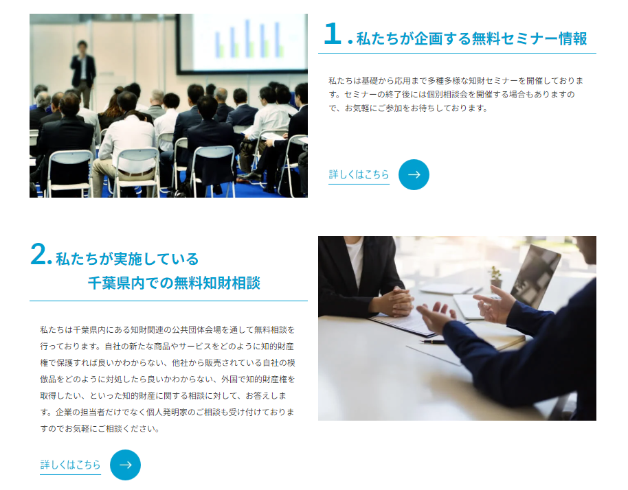新着情報の下には、開催する無料セミナーや無料知財相談などの詳細が見れるページへのリンクを置いています。
