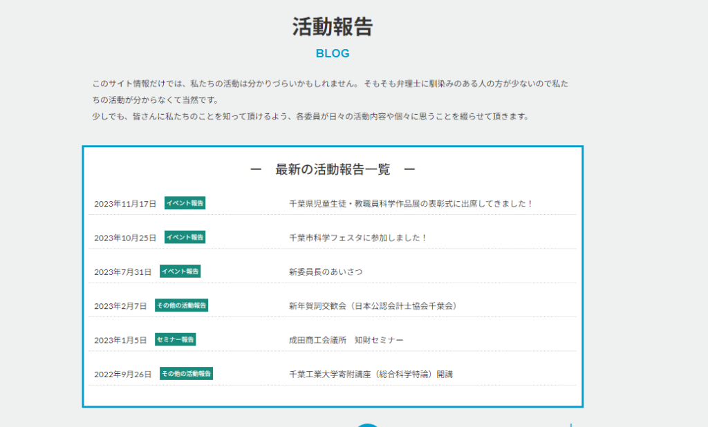 通常のホームページではブログやコラムとするところを、こちらのホームページでは活動報告という表記にしてあります。中身はいわゆるブログですが、イベントやセミナー、その他の活動報告といったカテゴリーにわけて委員会で実際に行われている活動をまとめています。ブログの記事ページでは、月ごとのアーカイブも見れるようにしています。