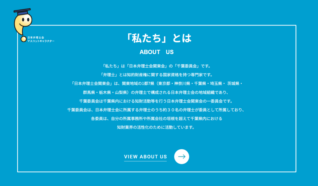 日本弁理士会関東会 千葉委員会とはどういうところなのかを説明するAbout Usページへのリンクを最上段に設置しています。TOPページ内では概要だけ手短に説明し、詳細は下層ページのAbout Usページを見てもらうような流れです。