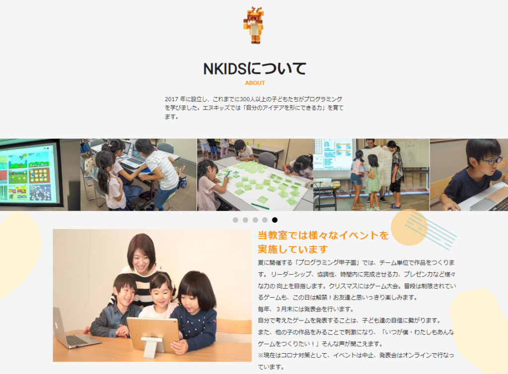 教室の紹介をするAboutパートでは、教室の様子を移した写真が、横にスライドするような作りになっています。またイベントが盛りだくさんで、楽しくプログラミングが学べる教室というのが伝わってきます。