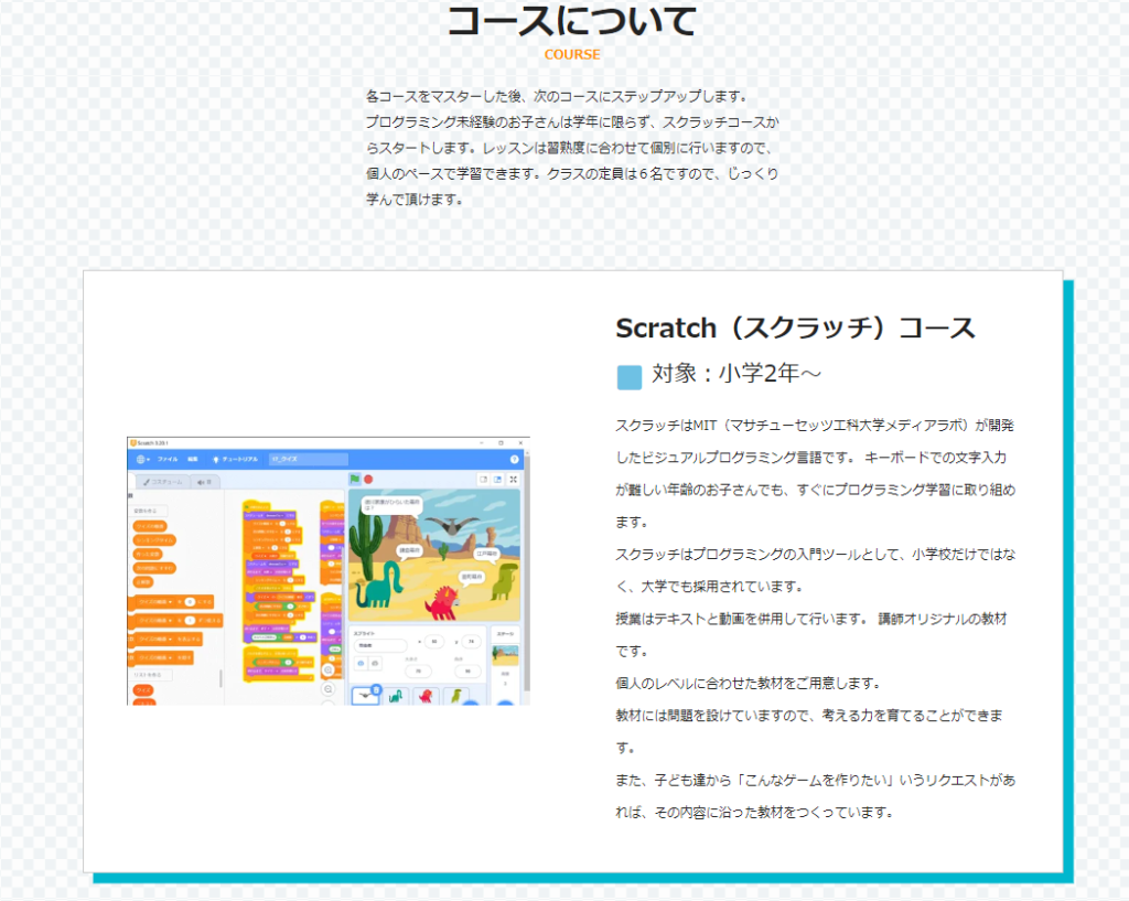 コースについてのところでは、こちらの教室で開催されているコースの種類と対象学年、またそのコースで取り扱う内容の説明が書かれています。