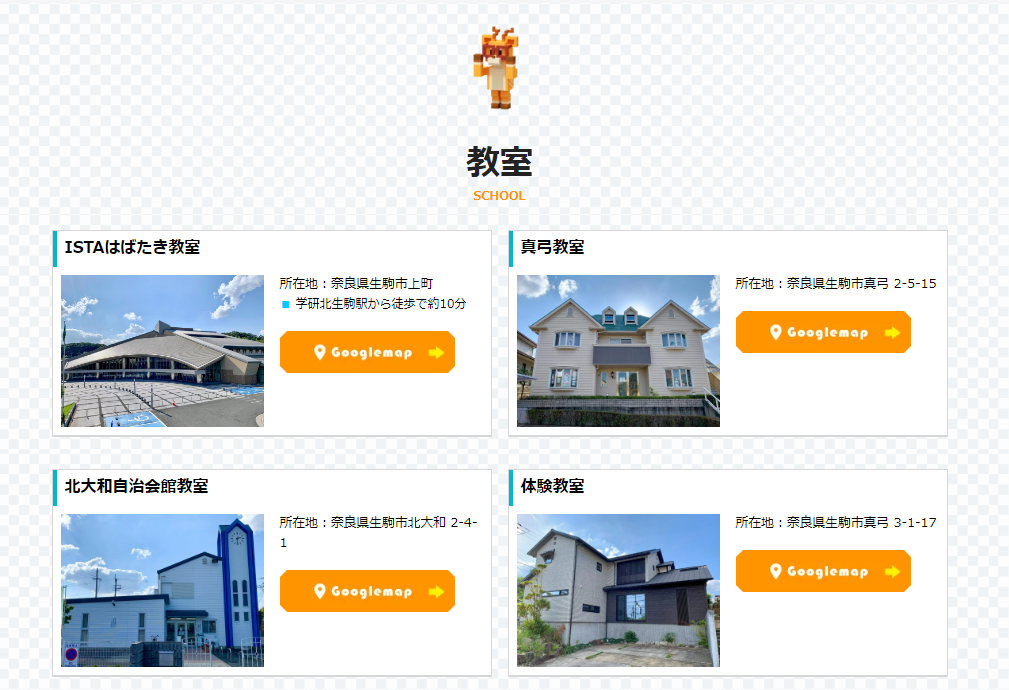 指導は奈良県内の4教室で行われているようです。住所とともにGoogleマップへのリンクもありますので、詳細な場所や行き方がわかりやすくなっています。