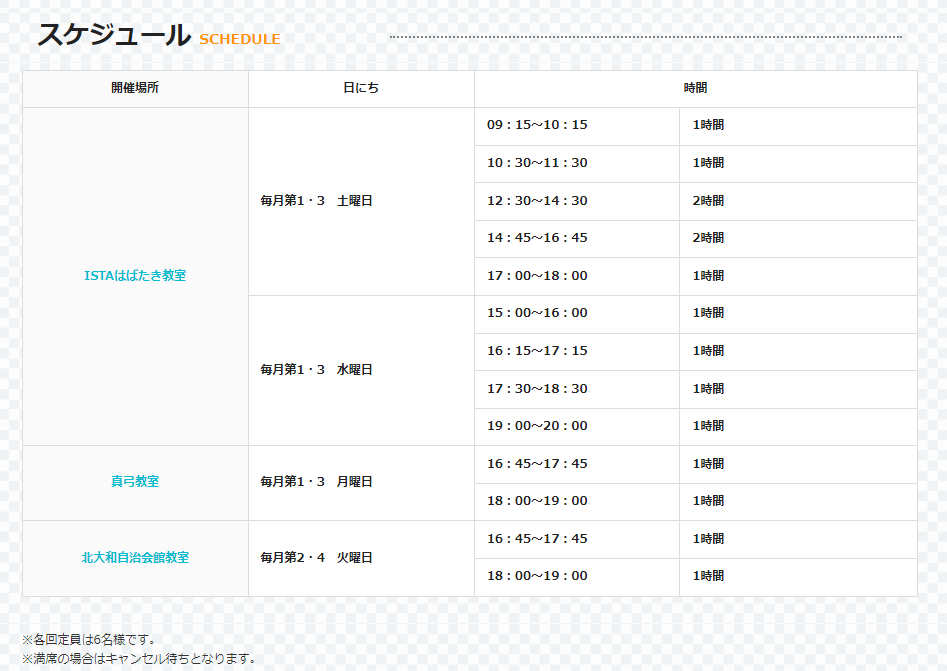 スケジュールのところには開催場所と日に、開催時間などがまとめられています。土曜日は午前中から、平日は学校終わりの時間に通いやすく設定されています。