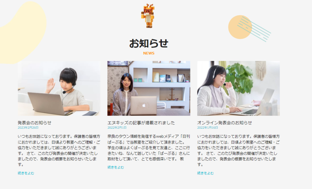 お知らせ欄では教室からのお知らせが掲載されています。