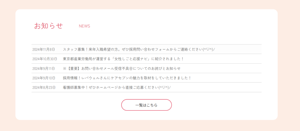 訪問看護リハビリステーションのホームページを制作しました。訪問介護リハビリステーションとは、介護職員や理学療法士・作業療法士などの専門スタッフが、利用者の自宅や居住施設を定期的に訪問し、日常生活の介助や身体機能の維持・回復を目的としたリハビリテーションを提供することで、安心して在宅生活を続けられるよう支援する施設・事業所です。全体はTOPページの他、事業所について、サービス案内、採用情報、事業所概要などで構成されています。今回はオリジナル制作プランで制作いたしました。全体のデザインは、ロゴに使われている濃い目のピンク系の色を使いつつ、丸味のある字体を使って、優しい雰囲気を出しています。