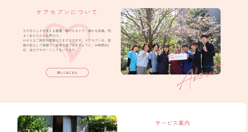 ロゴはお客様にご準備いただきました。ヘッダー部はメインのナビゲーション(トップ、ケアセブンについて、サービス案内、採用情報、事業所概要)とサブのナビゲーション(よくある質問、プライバシーポリシー)、そしてお問い合わせボタンで構成しています。