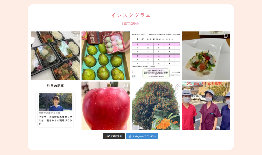 トップページ下部にはインスタグラムを表示しています。雰囲気を伝えるという意味ではインスタグラムの投稿は非常に効果的です。なお制作時にX(旧ツイッター)のタイムライン表示を希望されるお客様がいらっしゃいますが、Xはログインしているユーザーにしか表示されない(=Xアカウントをもってない人には表示されない)仕様になっていますので、個人的にはおすすめしておりません。