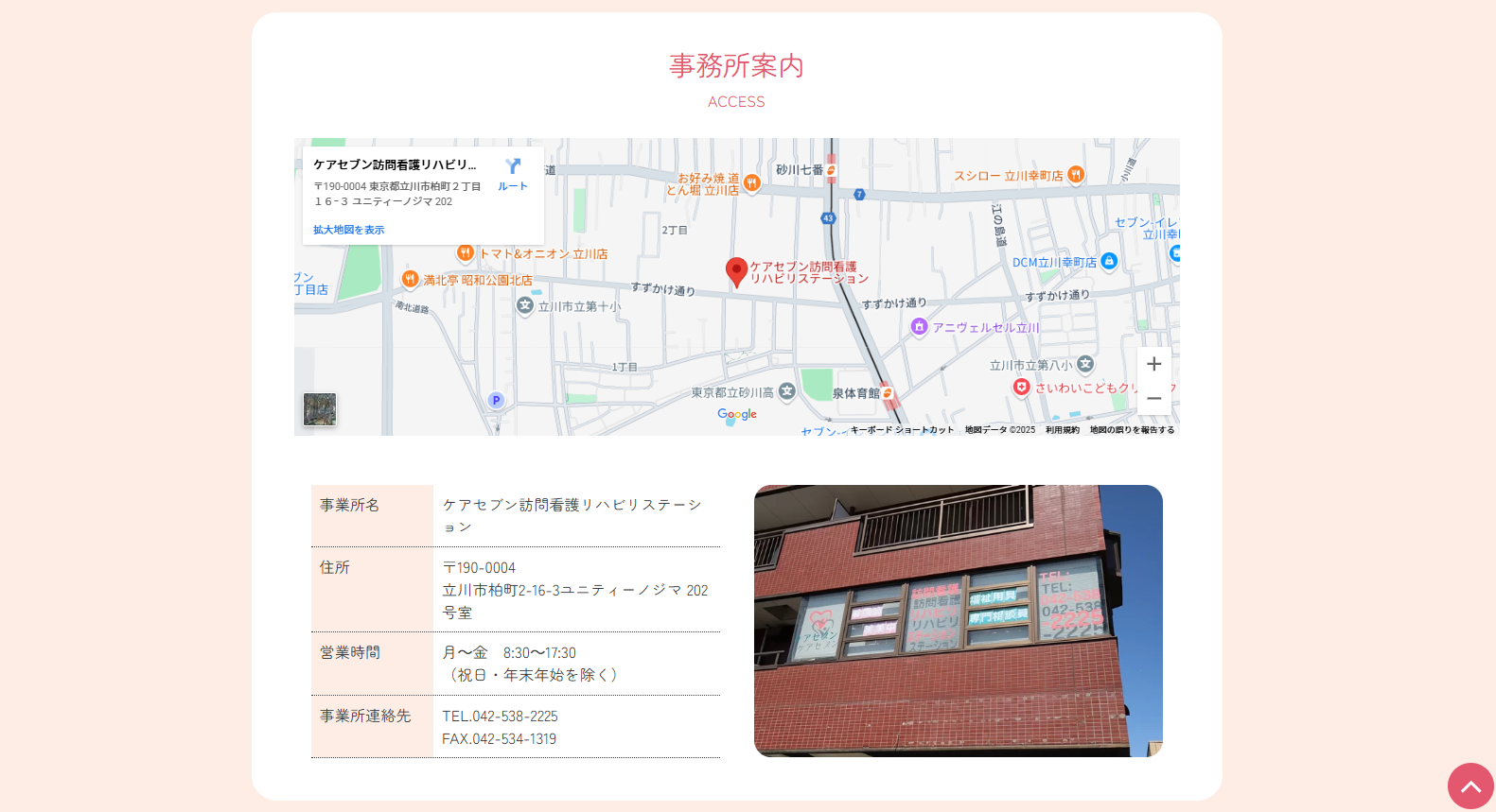 事業所案内部分はGoogleマップと基本情報および外観写真で構成しています。