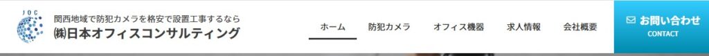 ヘッダー部分は企業ロゴとナビゲーションメニュー、右端に問い合わせボタンを配置しています。ナビゲーションは「ホーム」「防犯カメラ」「オフィス機器」「求人情報」「会社概要」で構成され、主要コンテンツへ直結するシンプルな設計です。右上の「お問い合わせ」ボタンは青色で強調され、行動喚起を促す役割を担っています。ヘッダー全体は背景を白基調とし、要素が明確に区切られているため、視覚的に迷いのない導線を確保しています。