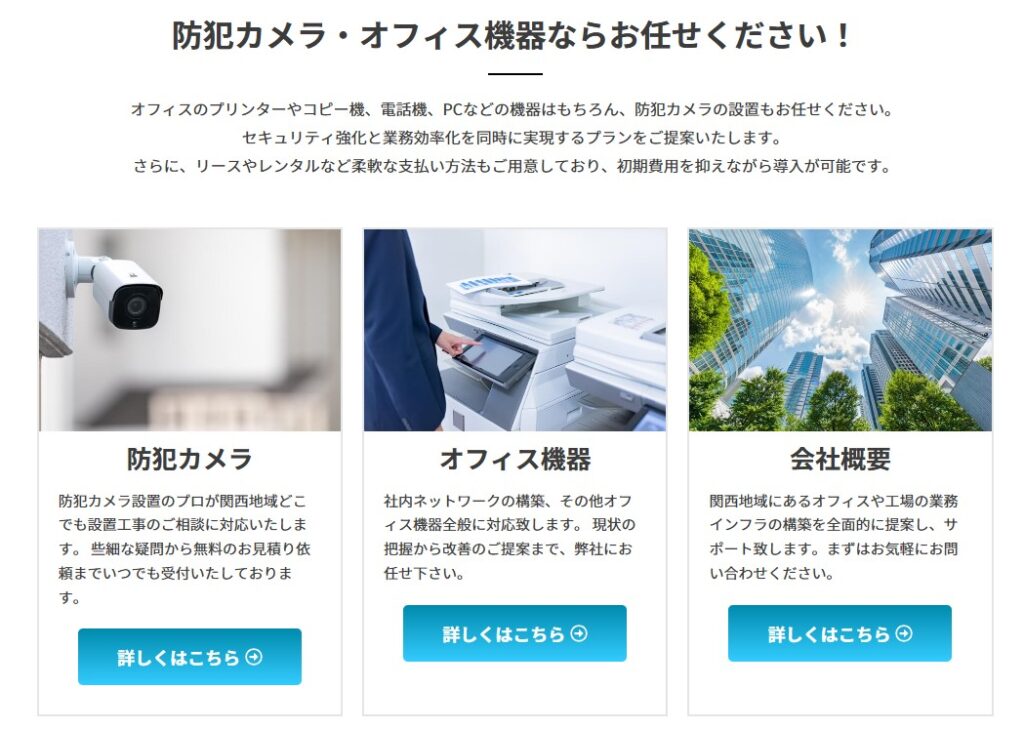 メインビジュアル直下には「防犯カメラ」「オフィス機器」「会社概要」の3つのカード型コンテンツを設置しています。それぞれにアイキャッチ写真と短文の説明を加え、下部に「詳しくはこちら」ボタンを設置しています。カードは均等配置され、利用者が求める情報に迅速にアクセスできるよう工夫されています。防犯カメラでは設置効果や活用範囲を説明し、オフィス機器ではネットワーク機器や複合機などの提供範囲を示しています。会社概要では事業の信頼性を強調する設計を採用しています。