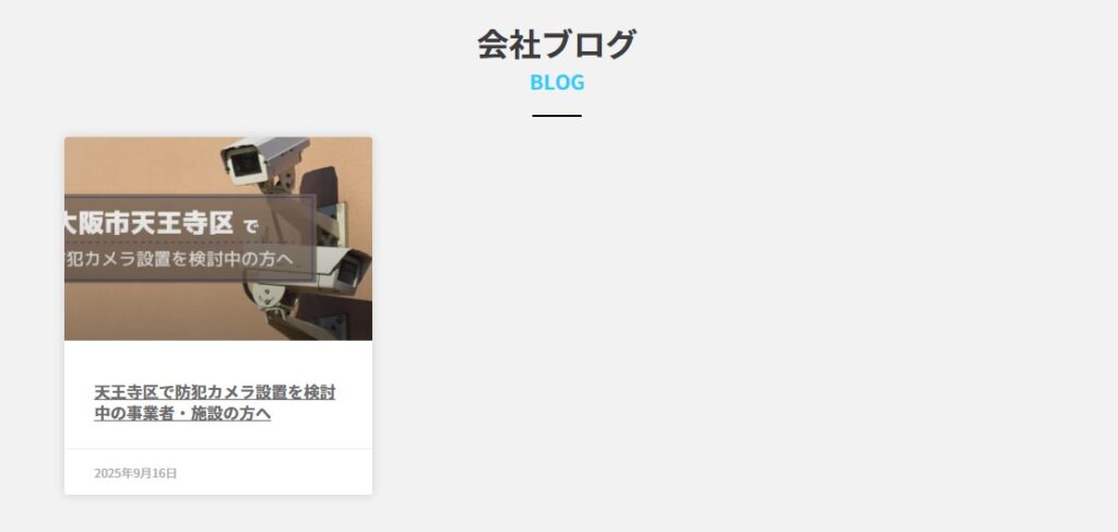 続くエリアには「会社ブログ」として記事一覧を設置しています。カード型のブログ記事には「大阪市淀川区で防犯カメラ設置を検討中の方へ」「大阪市天王寺区で防犯カメラ設置を検討中の方へ」という具体的な地域名を含んだタイトルを表示しています。各カードには日付とサムネイル画像を付与し、記事内容が直感的に把握できる設計です。地域名を冠した記事を並べることで、SEO対策や地域密着性の訴求を同時に実現しています。