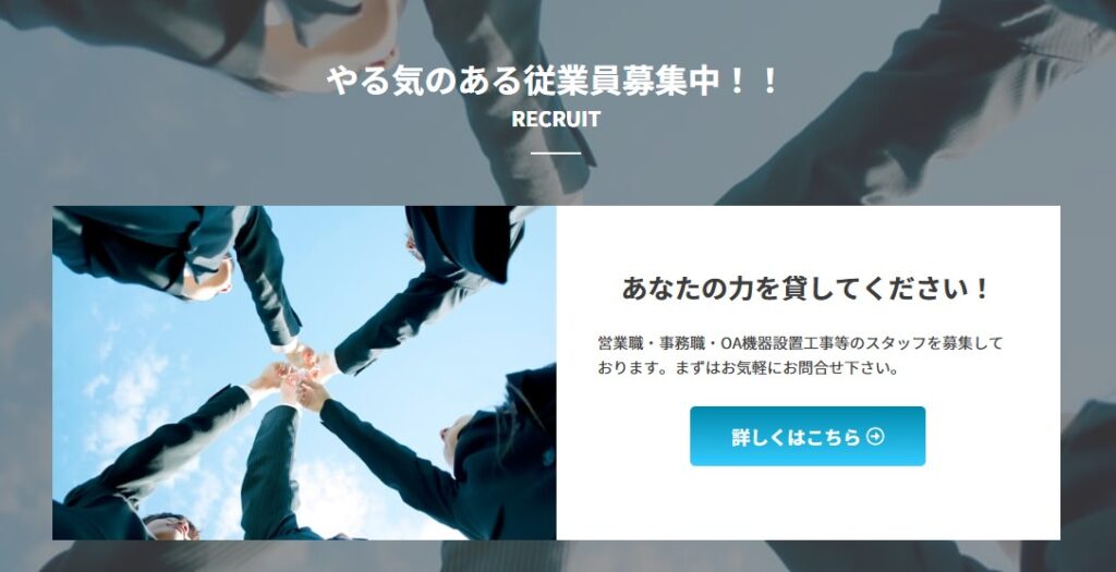 次のセクションでは「やる気のある従業員募集中」という大きな見出しを設け、リクルート情報を訴求しています。背景には複数人が手を合わせる写真を用い、協力や団結を連想させる構成です。中央には「あなたの力を貸してください」というメッセージを配置し、求職者への直接的な呼びかけを実現しています。下部には「詳しくはこちら」ボタンを設け、求人情報の詳細ページへの導線を確保しています。全体的に採用意欲の高さを明確に伝える構造となっています。