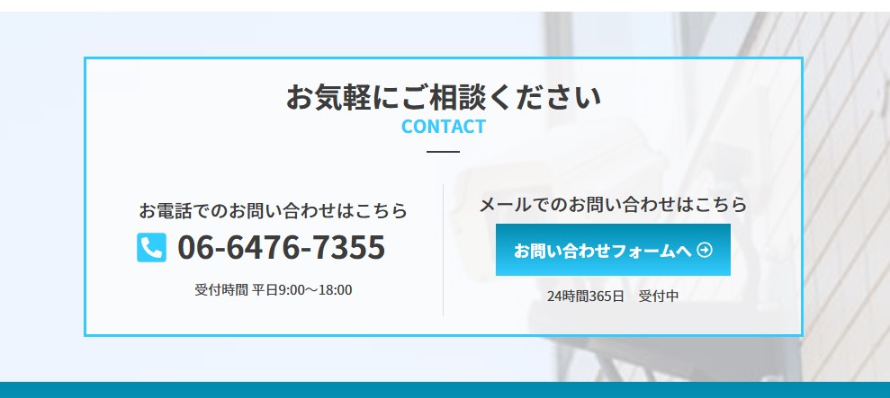 フッター直前には「お気軽にご相談ください」という大見出しを配置し、問い合わせ先を明確に示しています。電話番号「06-6476-7355」を大きく掲載し、受付時間を平日9:30〜18:00と記載しています。横には「お問い合わせフォームへ」のボタンを設置し、メールでの連絡手段も提示しています。問い合わせ手段を電話とフォームの2種類に限定し、行動導線を整理することでユーザーが迷わず利用できる設計になっています。