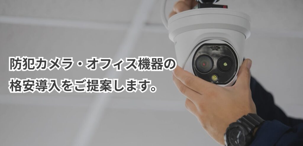 ファーストビューには防犯カメラの写真を背景としたビジュアルを配置し、「防犯カメラ・オフィス機器の格安導入をご提案します」というメッセージを重ねています。ここで主要な訴求ポイントを端的に伝え、サイト訪問者に対する事業の方向性を即座に明示しています。写真は手でカメラを設置する様子を切り取っており、業務領域の具体性を高めています。テキストは中央配置でバランスよくレイアウトし、背景画像とのコントラストにより視認性を確保しています。
