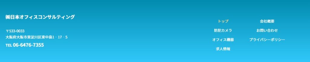 最下部のフッターには会社名「関西日本オフィスコンサルティング」、住所「大阪府大阪市淀川区西宮原1-7-5」、電話番号「06-6476-7355」が記載されています。あわせてトップ、会社概要、採用情報、プライバシーポリシーなどのメニューリンクを設置しています。背景は青を基調にし、白抜き文字で情報を明確に見せています。著作権表記と制作会社クレジットを配置し、ページ全体の締めくくりを整えています。
